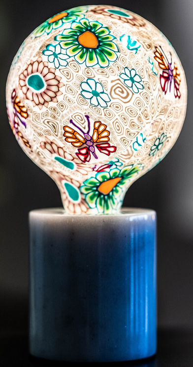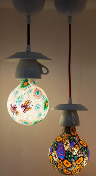Dekorativna svetilka s cvetličnim motivom na beli podlagi.
