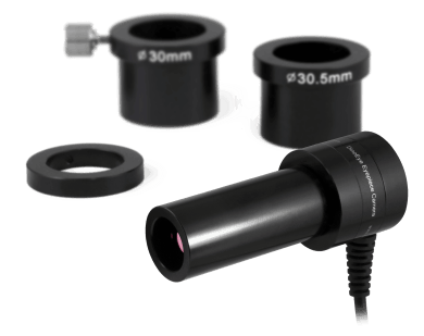 Veliko vidno polje vam omogoča, da z eno sliko zajamete več podrobnosti. V enega od okularjev vstavite Dino Eye AM7025X s premerom 23mm, priložena sta adapterja za velikosti 30 in 30.5mm. Adapter 30.5mm ima tudi navoj za C-mount adapter (ta ni priložen, mogoče ga je kupiti za doplačilo, art. F25MM = 389.18eur z DDV na kos).
