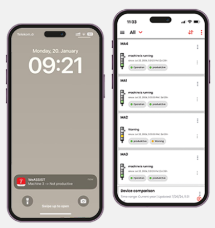 Prejmite pomembne informacije v realnem času – s potisnimi obvestili na osebnem računalniku in mobilnih napravah. V WeASSIST-u so vsi vpleteni vedno na tekočem: napake, spremembe statusa in dogodki se poročajo takoj, tako da lahko odgovorni reagirajo takoj in ne glede na lokacijo. Optimizirajte svojo proizvodnjo z učinkovito izmenjavo informacij in hitrimi odzivnimi časi.